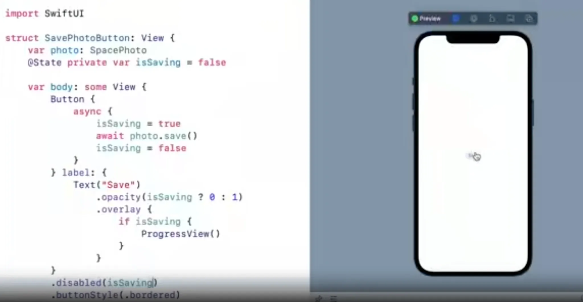 - 저장하는 동안 진행 표시를 위해 @State 프로퍼티 추가
