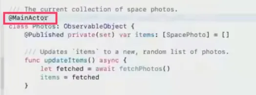 - @MainActor 어노테이션을 추가하면 컴파일로는 Photos의 프로퍼티와 메서드들이 오직 메인 액터에서만 접근되도록 보장함