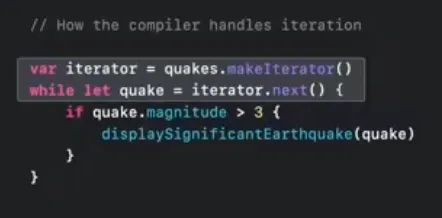 - 먼저, iterator 변수를 만들고, 그 다음에 while 루프를 사용해 next가 호출될 때마다 생성되는 quake를 가져옴