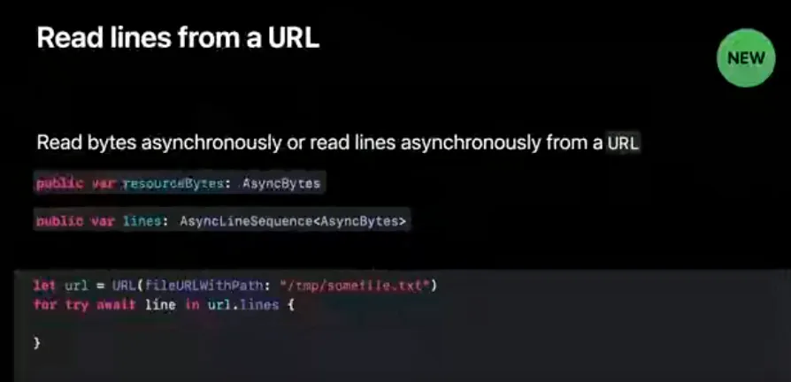 - URL에서 파일이든 네트워크든, 그 내용으로부터 line 단위 AsyncSequeqnce를 반환하는 프로퍼티