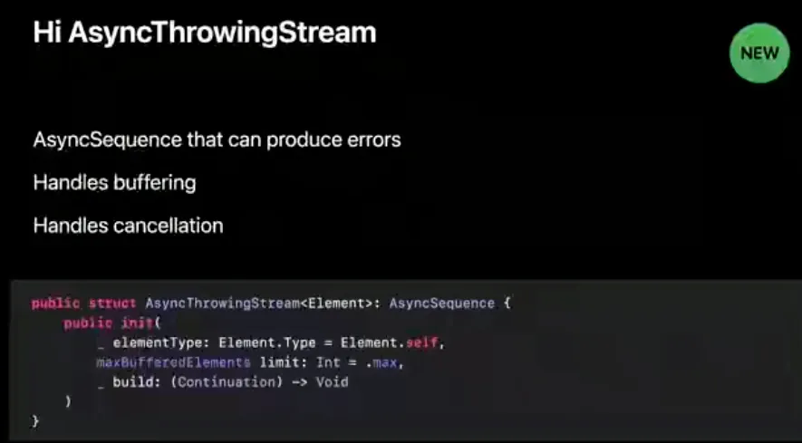 - AsyncThrowingStream도 AsyncStream과 같은 유연성과 안전성을 제공하면서, 반복 중에 에러를 throw할 수 있음